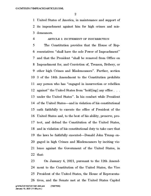 2. 2. 2 United States of America, in maintenance and support of1 its impeachment against him for high crimes and mis-2 demeanors.3 ARTICLE I: INCITEMENT OF INSURRECTION4 The Constitution provides that the House of Rep-5 resentatives ‘‘shall have the sole Power of Impeachment’’6 and that the President ‘‘shall be removed from Office on7 Impeachment for, and Conviction of, Treason, Bribery, or8 other high Crimes and Misdemeanors’’. Further, section9 3 of the 14th Amendment to the Constitution prohibits10 any person who has ‘‘engaged in insurrection or rebellion11 against’’ the United States from ‘‘hold[ing] any office . . .12 under the United States’’. In his conduct while President13 of the United States—and in violation of his constitutional14 oath faithfully to execute the office of President of the15 United States and, to the best of his ability, preserve, pro-16 tect, and defend the Constitution of the United States,17 and in violation of his constitutional duty to take care that18 the laws be faithfully executed—Donald John Trump en-19 gaged in high Crimes and Misdemeanors by inciting vio-20 lence against the Government of the United States, in21 that:22 On January 6, 2021, pursuant to the 12th Amend-23 ment to the Constitution of the United States, the Vice24 President of the United States, the House of Representa-25 tives, and the Senate met at the United States Capitol26 VerDate Mar 15 2010 23:08 Jan 10, 2021 Jkt 000000 PO 00000 Frm 00002 Fmt 6652 Sfmt 6201 C:USERSMLLEWISAPPDATAROAMINGSOFTQUADXMETAL11.0GENCARTICLES.X January 10, 2021 (11:08 p.m.) G:CMTEJD17IMPEACH2ARTICLES.XML g:VHLC011021011021.023.xml (785770|5)