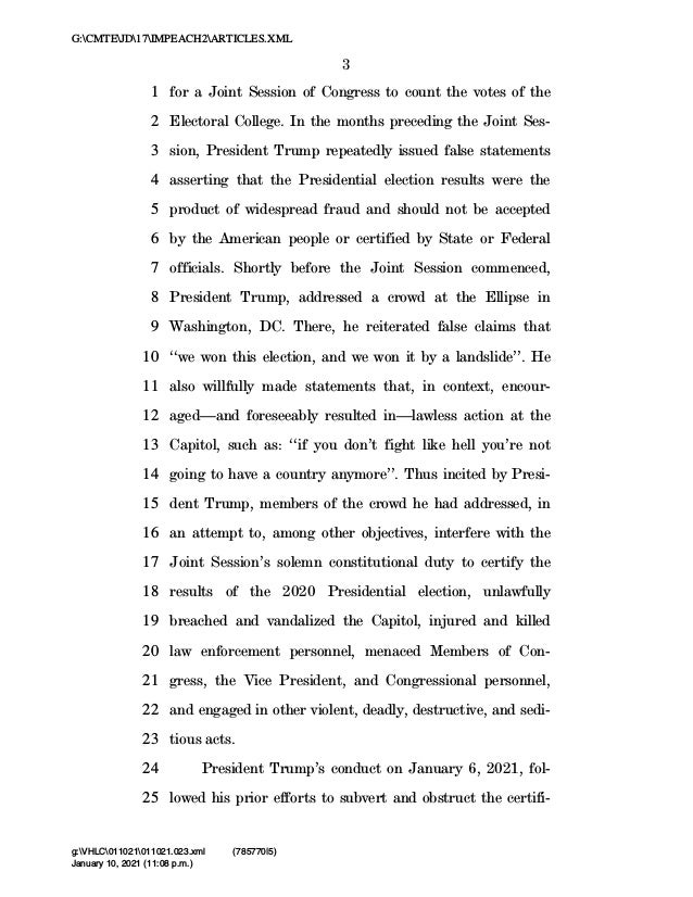 3. 3. 3 for a Joint Session of Congress to count the votes of the1 Electoral College. In the months preceding the Joint Ses-2 sion, President Trump repeatedly issued false statements3 asserting that the Presidential election results were the4 product of widespread fraud and should not be accepted5 by the American people or certified by State or Federal6 officials. Shortly before the Joint Session commenced,7 President Trump, addressed a crowd at the Ellipse in8 Washington, DC. There, he reiterated false claims that9 ‘‘we won this election, and we won it by a landslide’’. He10 also willfully made statements that, in context, encour-11 aged—and foreseeably resulted in—lawless action at the12 Capitol, such as: ‘‘if you don’t fight like hell you’re not13 going to have a country anymore’’. Thus incited by Presi-14 dent Trump, members of the crowd he had addressed, in15 an attempt to, among other objectives, interfere with the16 Joint Session’s solemn constitutional duty to certify the17 results of the 2020 Presidential election, unlawfully18 breached and vandalized the Capitol, injured and killed19 law enforcement personnel, menaced Members of Con-20 gress, the Vice President, and Congressional personnel,21 and engaged in other violent, deadly, destructive, and sedi-22 tious acts.23 President Trump’s conduct on January 6, 2021, fol-24 lowed his prior efforts to subvert and obstruct the certifi-25 VerDate Mar 15 2010 23:08 Jan 10, 2021 Jkt 000000 PO 00000 Frm 00003 Fmt 6652 Sfmt 6201 C:USERSMLLEWISAPPDATAROAMINGSOFTQUADXMETAL11.0GENCARTICLES.X January 10, 2021 (11:08 p.m.) G:CMTEJD17IMPEACH2ARTICLES.XML g:VHLC011021011021.023.xml (785770|5)