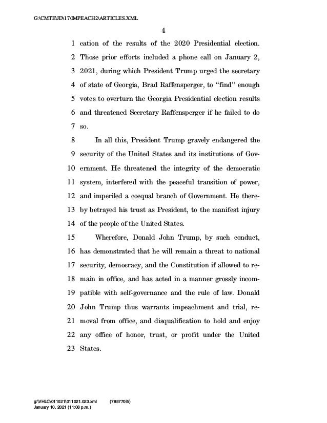4. 4. 4 cation of the results of the 2020 Presidential election.1 Those prior efforts included a phone call on January 2,2 2021, during which President Trump urged the secretary3 of state of Georgia, Brad Raffensperger, to ‘‘find’’ enough4 votes to overturn the Georgia Presidential election results5 and threatened Secretary Raffensperger if he failed to do6 so.7 In all this, President Trump gravely endangered the8 security of the United States and its institutions of Gov-9 ernment. He threatened the integrity of the democratic10 system, interfered with the peaceful transition of power,11 and imperiled a coequal branch of Government. He there-12 by betrayed his trust as President, to the manifest injury13 of the people of the United States.14 Wherefore, Donald John Trump, by such conduct,15 has demonstrated that he will remain a threat to national16 security, democracy, and the Constitution if allowed to re-17 main in office, and has acted in a manner grossly incom-18 patible with self-governance and the rule of law. Donald19 John Trump thus warrants impeachment and trial, re-20 moval from office, and disqualification to hold and enjoy21 any office of honor, trust, or profit under the United22 States.23 VerDate Mar 15 2010 23:08 Jan 10, 2021 Jkt 000000 PO 00000 Frm 00004 Fmt 6652 Sfmt 6201 C:USERSMLLEWISAPPDATAROAMINGSOFTQUADXMETAL11.0GENCARTICLES.X January 10, 2021 (11:08 p.m.) G:CMTEJD17IMPEACH2ARTICLES.XML g:VHLC011021011021.023.xml (785770|5)